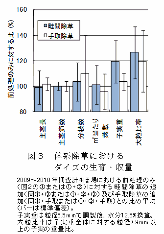 ダイズ収量は、畦間除草の追加により、前処理のみに比べ増加する(図3)。また、手取除草との比較から、畦間除草の追加によるダイズの生育及び収量への悪影響は認められない。 |