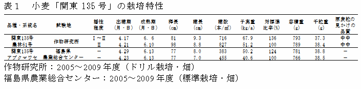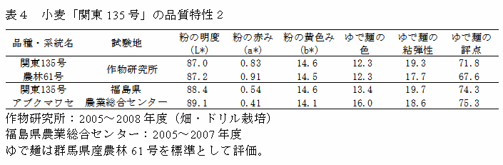 小麦新品種候補「関東135号」は早生で穂発芽に強い。やや低アミロース含量であるため、日本麺の食感が優れる。福島県で奨励品種に採用予定である。 |