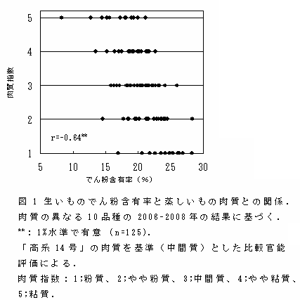 サツマイモの肉質は、加熱調理後にホクホクした食感をもたらす粉質と、ねっとりした食感になる粘質とに大別され、その違いは食味や加工適性に大きく影響する。良食味で加工適性に優れたサツマイモ品種を育成するうえで肉質調査が欠かせないが、従来は主に相対的官能評価によっており、年次間変動や評価者の主観の違いなどの影響が無視できなかった。そこで、肉質の客観的な絶対評価法の確立や変動要因の解明に資するために、塊根のでん粉等成分の特性および組織形態などと肉質との関係を明らかにすることを目的とした。 | ||||||||