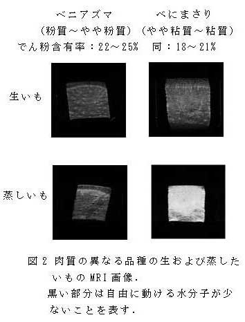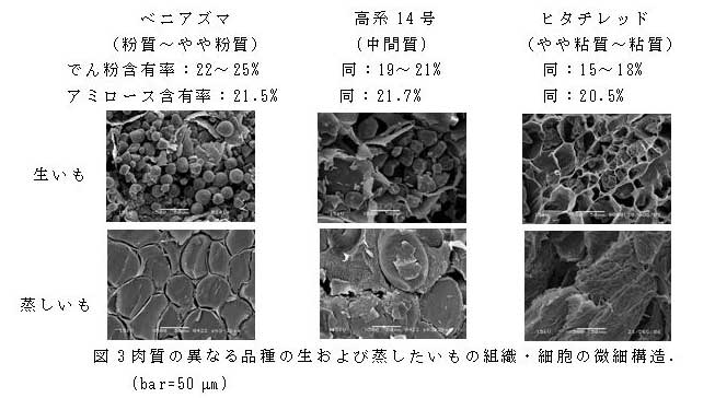 蒸したサツマイモの肉質の違いにはでん粉含有率に加えて水分動態や組織・細胞形態の相違が関わっている。でん粉が多く、肉質が粉質傾向のいもでは粘質傾向のいもと異なり、蒸した後も細胞の形が維持され、水分子が糊化でん粉ゲルとともに細胞内に留まる。 | ||||||||