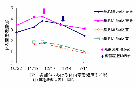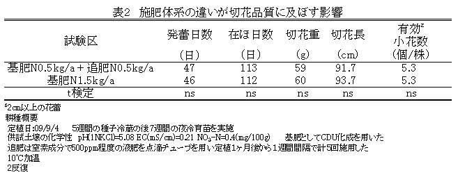 トルコギキョウの冬季開花作型では、基肥主体から基肥+生育前半(発蕾期まで)の追肥体系に切り替えることにより、季咲作型より施肥窒素量を削減しても切花長70cm程度、有効小花数4個以上の切花品質が確保できる。 | ||||||