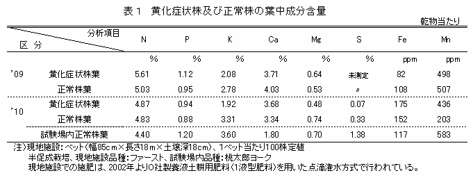 黄化葉の成分をみると、症状が見られない正常葉に比較してカリウム、イオウ含量が低く、その傾向はイオウで顕著である。また、試験場内の隔離ベット栽培(被覆リン硝安カリ+園芸化成)でのトマト葉と比較するとイオウ含量が大きく異なり、現地施設の正常葉株も潜在的な欠乏状態であることが疑われる(表1)。 |