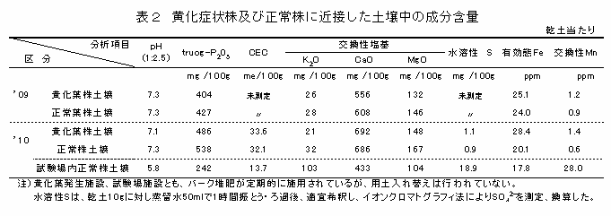 土壌成分をみると、有効態リン酸、交換性カルシウム・マグネシウムが蓄積している反面、交換性カリウム、水溶性イオウが少ない傾向が認められる(表2)。 |