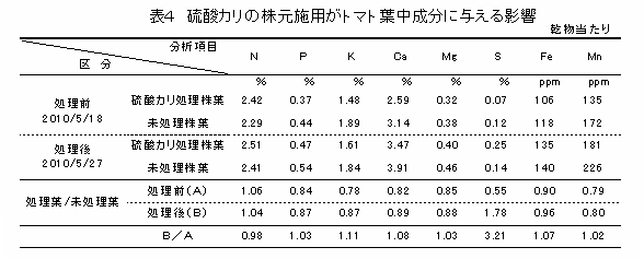 半促成作型において黄化症状を呈した株に硫酸カリを株当たり20gを株元に施用したところ、10日後には処理株の葉色が改善した。処理前後の葉成分中イオウ含量の変化は、他成分に比べ大きい(表4)。 |