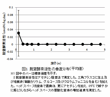 脱窒酵素活性は,総じて表層土(0~0.25m )で高い。一方、0.25m以深ではほとんどゼロに近く(図1)、脱窒作用による窒素浄化が表層土に限定されることが示唆される。 |