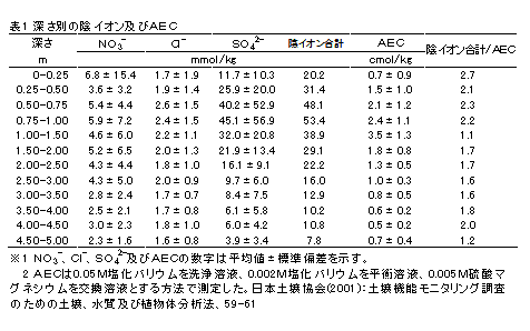 AECは表層土で0.7cmol/kg(平均値)である。腐植層下部の褐色土壌(約1~2mに分布)で2~3.5cmol/kg程度の値を示す場合もあるが、それ以深では1cmol/kg程度かそれ以下である。一方、硝酸、塩化物及び硫酸イオンの合計/ AEC比は深さ1mまで2以上の値を、1m以深でも1.5と同等以上の値を示し(表1)、各層位でAECに比べ過剰に存在している。このことは、陰イオン吸着による硝酸態窒素浸透の遅延効果が低下していることを示唆する。 |
