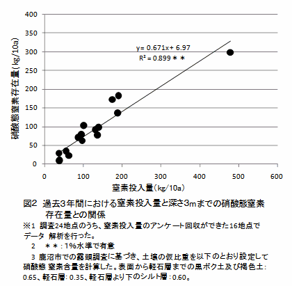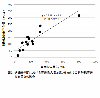 黒ボク土における硝酸態窒素の浸透速度が年間1m内外である知見があるため、過去3年間における化学肥料及び有機物由来の窒素投入量と深さ3mまでの土層内の硝酸態窒素存在量をプロットしたところ、有意な正の相関を得た(図2)。対象期間を5年間まで延長しても、直線の傾きは小さくなるが、同様に有意な正の相関を示す(図3)。これらのことと合わせ、硝酸態窒素の垂直分布が、表層から下層(5m)までほぼ一様に分布していることは、作物に吸収されない窒素の多くが下層に浸透することを示している。 |