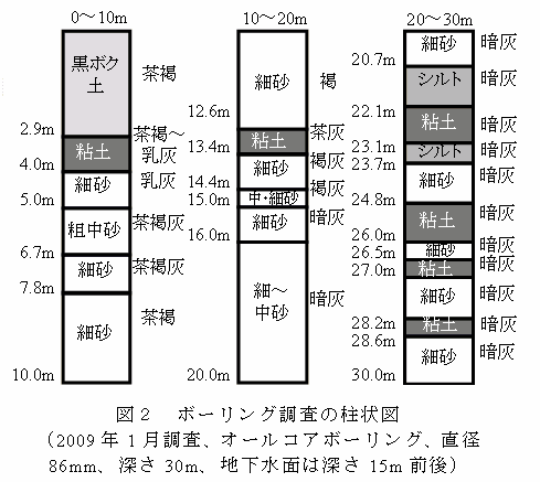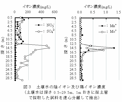 調査地点の土壌水の硝酸イオン濃度は、深さ12.5m以上では30~130mg/Lであるが、13.5m以下では2mg/L以下で低い。深さ13.5m以下は、土壌が暗灰色でマンガンイオン濃度が高いことから、還元状態にあると推測される。 | ||||||||||