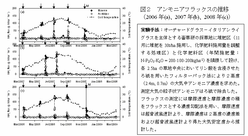 2. アンモニアフラックスは施肥直後に明瞭な揮散ピークがみられる(図2)。 |
