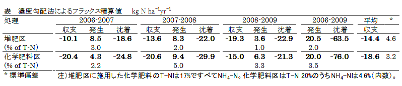 4. 年間のフラックスを積算した収支は、堆肥区で-10~-19 kg N ha-1 yr-1(平均-14.4)、化学肥料区で-15~-20 kg N ha-1 yr-1(平均-18.6)であり、両者で平均16.5 kg N ha-1 yr-1の乾性沈着が生じる(表)。 |