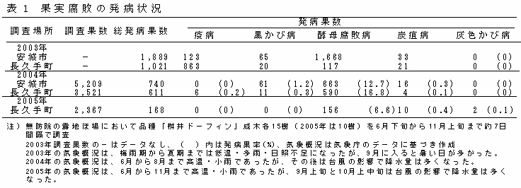 発生量が多く問題となる果実腐敗は、主に酵母腐敗病と疫病、次いで黒かび病、炭疽病が原因であり、灰色かび病の発生は非常に少なかった(表1)。 |