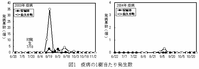 疫病は、梅雨期から夏期まで多雨の2003年に多発し、梅雨期から10月上旬まで発生が継続した(図1)。一方、夏期が小雨の2004年と2005年は、発生が非常に少ないか、発生が認められなかった(表1、図1)。 |