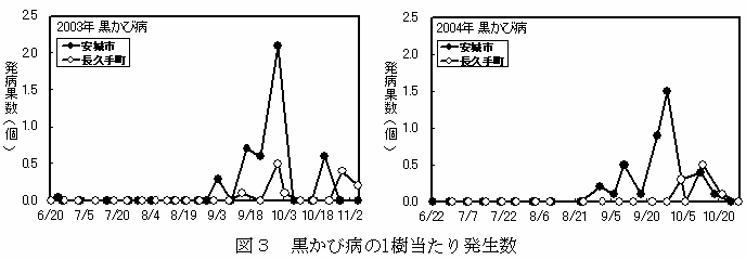 酵母腐敗病と黒かび病は、成熟果に発生し、9月を中心に、8月下旬から11月上旬までが発生時期であった(図2、3)。 |