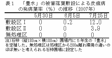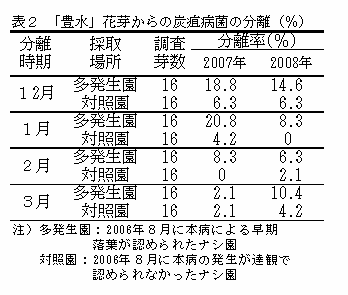 前年の被害落葉を敷き詰めた石枠(縦180cm×横180cm)に定植した5年生「豊水」樹で翌年に炭疽病が発生すること(表1)、12月~3月にナシ炭疽病多発生園から採取した枝の花芽から炭疽病菌が高率に分離されることから(表2)、本病原菌は被害落葉及び花芽で越冬し、第一次伝染源となる可能性が高い。 |