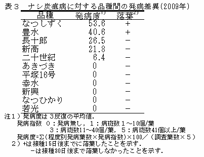 ナシ炭疽病の発病程度には品種間差があり、「豊水」及び「なつしずく」は高く、「長十郎」、「新高」及び「二十世紀」はやや高く、「あきづき」、「平塚16号」、「幸水」、「新興」、「なつひかり」及び「若光」は比較的低い(表3)。 |
