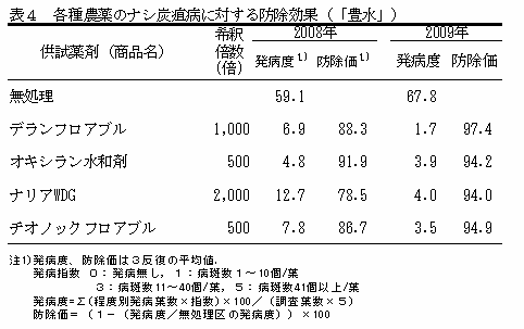 ナシ炭疽病に対する防除薬剤として、デランフロアブル、オキシラン水和剤、ナリアWDG及びチオノックフロアブルの防除効果が高い(表4)。 |