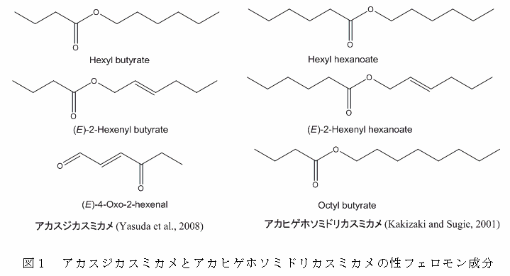すでにアカスジカスミカメではhexyl butyrate、(E)-4-oxo-2-hexenal、(E)-2-hexenyl butyrate (Yasuda et al., 2008)、アカヒゲホソミドリカスミカメではhexyl hexanoate、(E)-2-hexenyl hexanoate、octyl butyrate (Kakizaki and Sugie, 2001)のそれぞれ3成分からなる性フェロモンが同定され(図1)、それぞれの合成フェロモン剤は種特異的な誘引を示す。 |