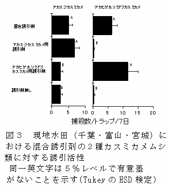 2種斑点米カメムシ、アカスジカスミカメとアカヒゲホソミドリカスミカメのフェロモン成分を混合しても雄に対する誘引活性は低下しないことから、フェロモン成分の混合誘引剤を用いることにより、2種をひとつのトラップで同時にモニタリングできる。 |