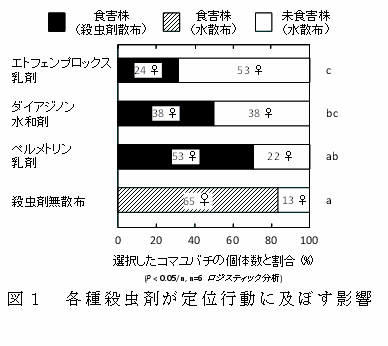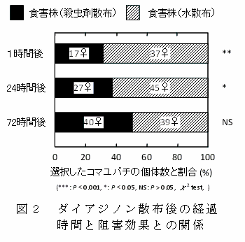 食害株(水散布)とダイアジノンを散布した食害株とを提示した場合、ダイアジノン散布後1時間から24時間経過した時点では定位行動に及ぼす阻害効果が検出されるが、散布後72時間経過した時点で阻害効果は見られなくなる(図2)。 |