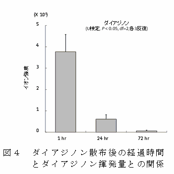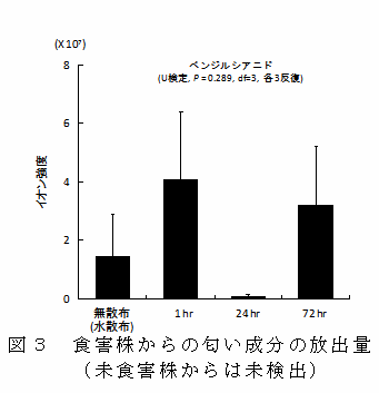 食害株からのベンジルシアニド放出量はダイアジノン散布後の経過時間によって有意に変動しない(図3)。一方、ダイアジノン散布後1時間から24時間経過した時点では、ベンジルシアニドに比べて大量のダイアジノンが食害株から揮発成分として放出されるため、食害株に対する定位行動に影響が生じるものと思われる(図4)。また、散布後72時間経過した時点でダイアジノンの揮発量は少なくなり、阻害効果が弱まるものと思われる(図4)。 |