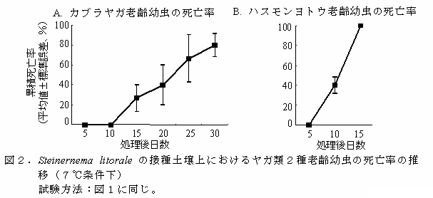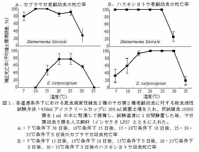 Steinernema litoraleは7℃から25℃で、カブラヤガおよびハスモンヨトウ老齢幼虫に対して殺虫活性を示し、特に、10℃以下の低温環境下では市販の線虫製剤より活性が高い。 | ||||||||