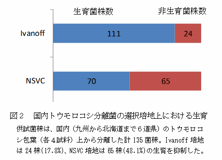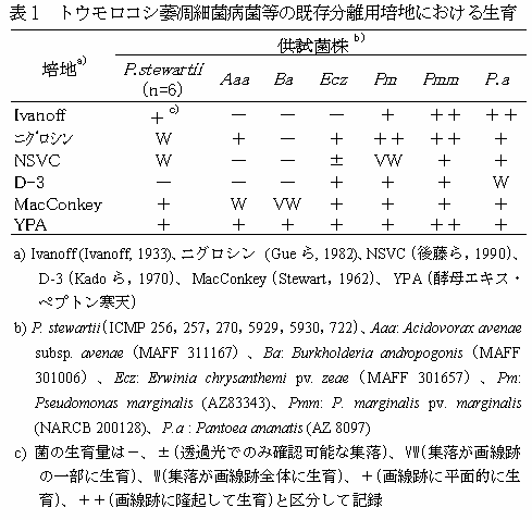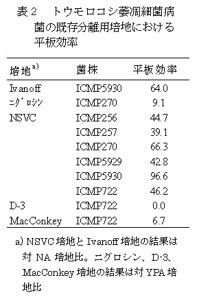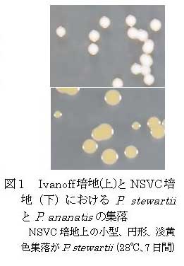 Pantoea ananati sの分離用に開発されたNSVC選択培地は、国内既発生のトウモロコシの病原・表生細菌の生育を抑制するが、国内未発生のトウモロコシ萎凋細菌病菌の生育に影響が少なく、本病原菌に対する分離・検出用培地として適している。 | ||||||