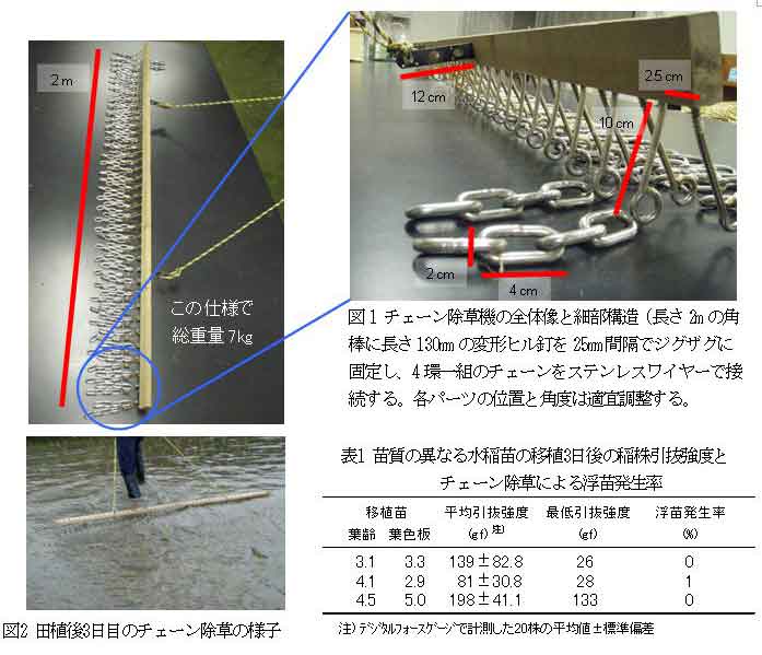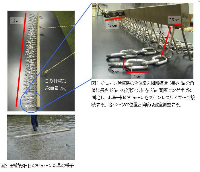 長さ2mの角棒に約80本のチェーンをのれん状に接続し約7kgのチェーン除草機を作製する。これを用いて水稲移植後2-4日目から5-7日間隔で4-5回作業すると、出穂期の雑草残存本数が半減する。 |