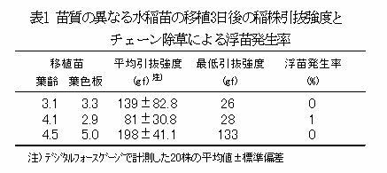 除草作業時の稲株の最低引抜強度が28gf以下では浮苗を生じる可能性がある (表1)。 |