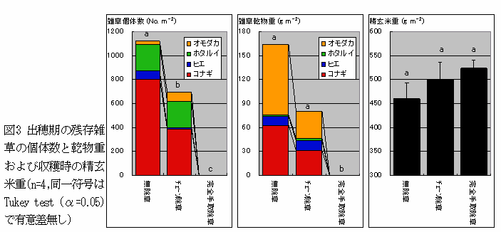 本成績は、新潟県長岡市のコシヒカリ有機栽培試験水田 (除草剤不使用10年目、細粒グライ土、 市販有機肥料5gN m-2、コナギ埋土種子量10万粒 m-2、ホタルイ埋土種子量10万粒 m-2、ヒエ埋土種子量2千粒 m-2) における試験結果である。