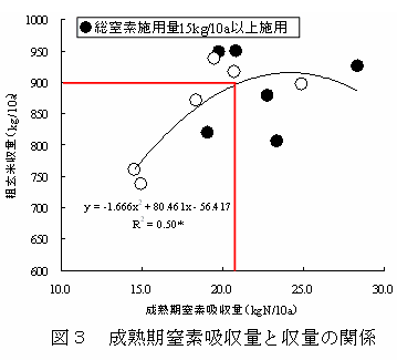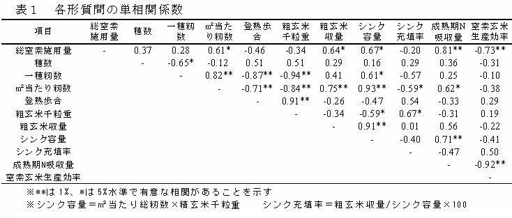 以上のことから投入する総窒素施用量を最小限に抑えつつ、収量10a 当たり900kgを確保するためのm2当たり籾数は41,000~42,000粒、成熟期の地上部窒素吸収量は10a 当たり21kg程度で、その際必要とする総窒素施用量は10a 当たり15kg程度と推定される。 |
