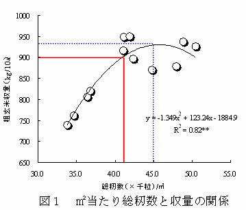 収量に最も影響を及ぼす収量構成要素はm2当たり籾数であり(表1)、収量10a 当たり900kgを確保するm2当たり籾数は41,000~42,000粒である(図1)。 |