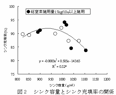図1より、収量はm2当たり籾数45,000粒を越えると低下傾向となる。これは、シンク充填率(収量/シンク容量×100)の低下によるものであるが、m2当たり籾数41,000~42,000粒であればシンク充填率は高く維持できる(図2)。 |