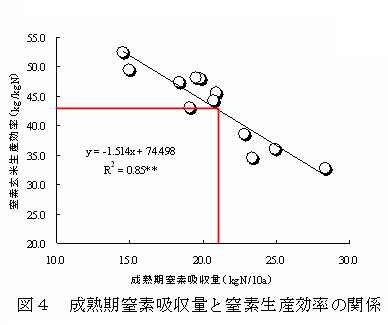 総窒素施用量を増量すると、m2当たり籾数および成熟期の窒素吸収量が増加し、収量は増加する傾向にあるが(表1)、成熟期の地上部窒素吸収量当たりの窒素玄米生産効率は低下する(図4)。 |