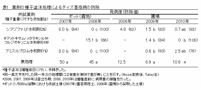 ダイズ茎疫病に対して、粉状消石灰を施用し、土壌pHを6以上に矯正すると発病が軽減される。また、薬剤の種子塗沫処理には実用的な防除効果があり、両者を併用することにより、さらに防除効果が高まる。 | ||||||