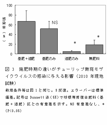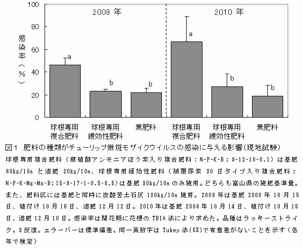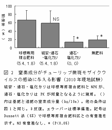 窒素施用方法の違いがチューリップ微斑モザイクウイルスの感染率に影響する | ||||||||