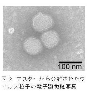 両罹病株からは径約100nmのトスポウイルス様の粒子が観察される(図2)。 |