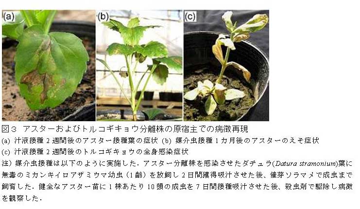 両罹病株からそれぞれ分離したウイルス株(アスター分離株、トルコギキョウ分離株)を汁液接種あるいはミカンキイロアザミウマを介して接種することにより原病徴が再現され(図3a-c)、同ウイルスが再分離される。 |