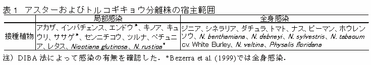 両分離株はいずれも汁液接種により8科25種の植物に感染し、ホウレンソウ、ピーマン、トマト、シネラリアなどにえそなどの激しい全身病徴を呈する(表1)。 |