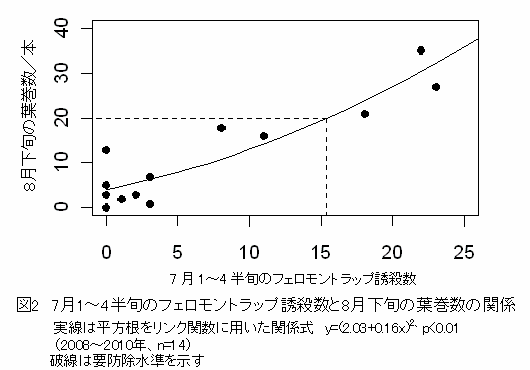 7月1~4半旬のフェロモントラップ誘殺数によりウコンノメイガの防除要否を判断でき、誘殺数が15頭以上で防除が必要である。 | ||||||||