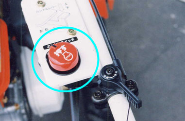 そこで、緊急時に手で押下することでエンジンを停止するための緊急停止装置(図)があり、具備した型式では、手で容易に操作できる位置に装備されています。