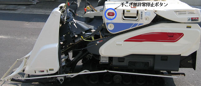 自脱型コンバインによる収穫作業においては、ほ場四隅で手刈りしたわらや詰まり除去で発生したわらに対して、手こぎ作業ができるような構造がユーザから求められています。しかし、この作業ではフィードチェーンの近くに立ってわらを手で直接フィードチェーンに送り込む必要があり、身体や衣服などが巻き込まれる事故が少なくありません。このような事態を回避するために、農業機械安全性検査では、手こぎ作業時に容易に手の届く場所へのエンジンの緊急停止装置の装備を求めています(図)。緊急停止装置作動後は、運転席でクラッチを切って再始動しないかぎり、手こぎ作業位置からはエンジンがかからない構造になっています。