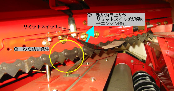 自脱型コンバイン後方のわら処理部には排わらチェーンやカッタがあります。生育が過剰な作物や水分が高い作物を収穫すると詰まりが発生することがあり、わら処理部を作動させたまま詰まりを取り除こうとして負傷する事故が見られます。このような事故を防ぐため、詰まりが発生した時にエンジンを停止してカッタや排わらチェーンの動力が自動的に切断される構造になっています。具体的には、排わらチェーンの動線上やカッタカバーにリミットスイッチなどのセンサが取付けられており、わらが滞留するとスイッチが「入」になってエンジンが切れるような仕組みになっています(図)。また、刈取部の詰まりに対応するために同様の装置を備えている型式もあります。