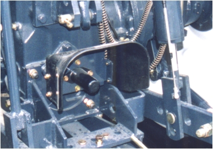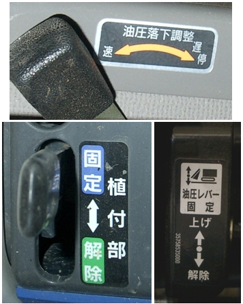 乗用トラクターの作業機昇降装置(3点リンクなど)やコンバインの刈取部など、農業機械には作業機を油圧で昇降させる構造を持つものが多くあります。これらを上げた状態でもし点検・整備などを行う場合は、作業機などが不意に降下するような構造だと、挟まれや下敷きなどの事故につながる危険性があります。このような事態を回避するために、昇降可能な作業機などについては、動力源が遮断された場合でも、これらを上げた位置で確実に固定できる構造を農業機械安全性検査では求めています。これらの固定方法として、昇降レバーを機械的に固定する方式や油圧弁を締め切る方式のものなどがあります。また、これらの装置は通常、運転席に操作装置を有していますが、乗用トラクターでは、フェンダー上などの外部にも操作装置を有するものがあります。