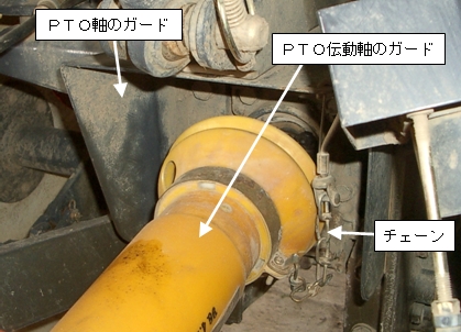 具体的にはPTO軸は、ガード(マスターシールド)などで作業者が不意に接触しないように防護し、PTO伝動軸は、自在継手部を含む全面をガードで防護するとともにガードには回り止め(チェーンなど)を設け、さらに、動力取入軸(PTO軸についても同様)は、軸等の一部が露出しないように、PTO伝動軸のガードとオーバーラップさせる構造にする必要があります。