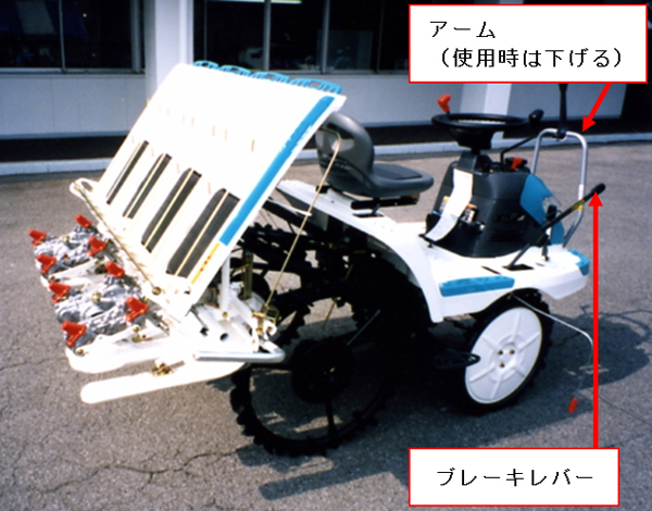 乗用型田植機の畦越えや斜面での移動、トラックなどへの積み下ろしなどの場合には、転倒などの危険が懸念されます。そこで、危険回避の手段として降車して操縦することが考えられます。比較的小型の乗用型田植機の中には、降車して運転するために、速度けん制をした上で、手動で走行操作ができる装置を装備したものがあります。