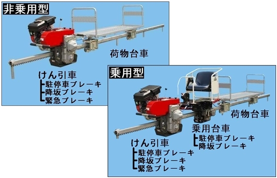 農用のモノレール(以下、単軌条運搬機)には非乗用型と乗用型があります。非乗用型の機械は動力車であるけん引車と荷物台車から構成され、人が乗るための座席は設置されておらず無人での走行が前提です。発進は地上の作業者が発進停止レバーを発進側に倒すことで行い、停止は軌条(レール)に設置した停止稈(ストッパー)により発進停止レバーを停止側に戻すことで行います。乗用型の機械はけん引車と荷物台車の間に、傾斜に応じて角度を変えられる座席を備えた乗用台車を連結しており、停止稈による自動停止だけではなく、運転者が任意の場所で手動停止させることができます。