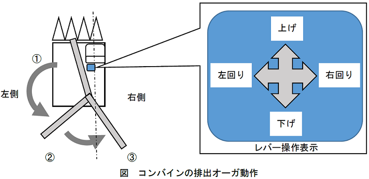 また、グレンタンク式のコンバインの排出オーガの操作レバーには、昔から「左回り」、「右回り」と表示されています。これについて私は少々混乱します。例えば、運転席から前向きの姿勢で、排出オーガを「左回り」操作すると、「左側」へ回転し(図の②)、そして、機械の後方を過ぎると運転者の「右側」へ回転していくことになります(図の③)。運転席から後ろ向きの姿勢で操作すると、運転者中心に見れば逆のことが起こります。そのため、時折「時計回り」、「反時計回り」と表記してはどうかと話題にしますが、取り合ってくれる方はいません。