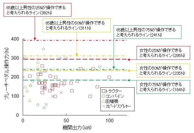 農業機械については、乗用トラクター56型式、自脱コンバイン10型式、田植機11型式、スピードスプレヤー6型式を調査しました。農業者の身体能力については、128名(65歳以上男性31名、女性38名)の被験者にご協力いただきました。