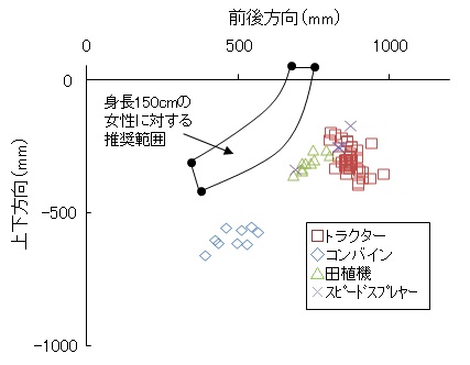 「座席調節範囲」についての結果を図3に示します。座席とペダルの相対位置を見ると、コンバインでは他機種よりも前後方向の距離が小さく、上下方向の距離が大きい結果となりました。これは、コンバインでは、刈取り状況を確認しながらの作業となるため、座面高さが他機種と比較して高いことが原因と考えられました。過去の研究結果を基に、身長150cmの女性による操作を考えた場合、全ての機種でペダルが推奨範囲外に位置しており、容易に操作できるとはいえませんでした。したがって、コンバインでは上下方向の距離を縮小、それ以外の機種では前後方向の調節範囲を拡大する必要がありました。しかし、コンバインでは、単純に座面を下げると作業性に問題が生じるため、作業性を保つ対策を検討する必要があります。