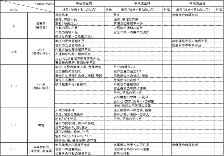 次に、個々の調査票から事故要因を漏れなく拾い上げるための分析表を作成しました(表)。分析表は、縦軸に当事者および当事者と関係する各要素(安全管理、機械、環境、補助作業者等)、横軸に時系列(事故の発生前、発生時、事故後)が配置された書式となっています。その各欄それぞれに、これまでに蓄積した事故調査結果から抽出・整理された事故要因が予め記載されています。